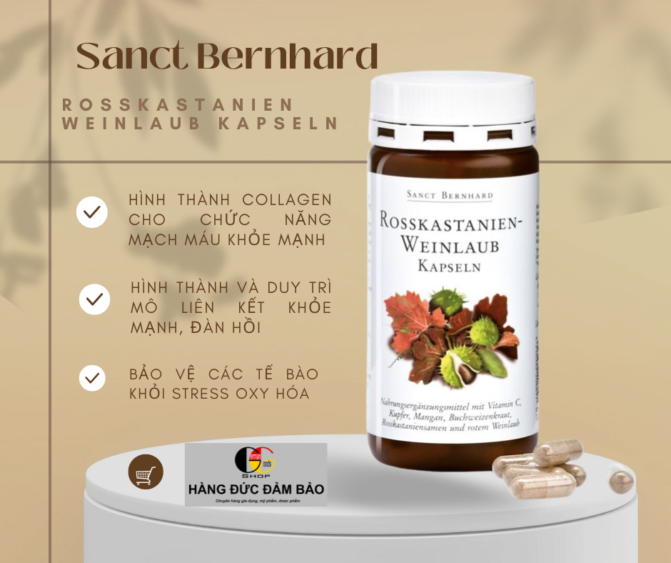 Với thực phẩm chức năng Rosskastanien-Weinlaub, sẽ bảo vệ thành mạch máu khỏe mạnh, duy trì mô liên kết khỏe mạnh, đàn hồi và các tế bào khỏi stress oxy hóa
